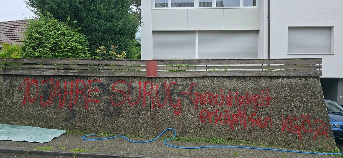 Die Fassade eines Mehrfamilienhauses war mit großflächigen, bunten Graffiti auf rauem Putz verschmiert. Die Bewohner befürchteten, dass weitere Schmierereien folgen würden.